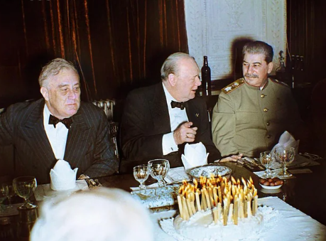 En la primera reunión de Roosevelt, Churchill y Stalin en TEHERAN a finales de 1943, entre brandy y whisky, crearon los vínculos y confianza necesaria para diseñar juntos la estrategia contra Hitler. Los dos primeros estaban en una orilla muy distinta a la de Stalin, pero conscientes del peligro, unieron sus fuerzas.
